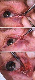 If entropion develops because of scar tissue or a previous surgical procedure, the surgeon may take some skin from behind the ear or the upper eyelid and graft it onto the lower eyelid.